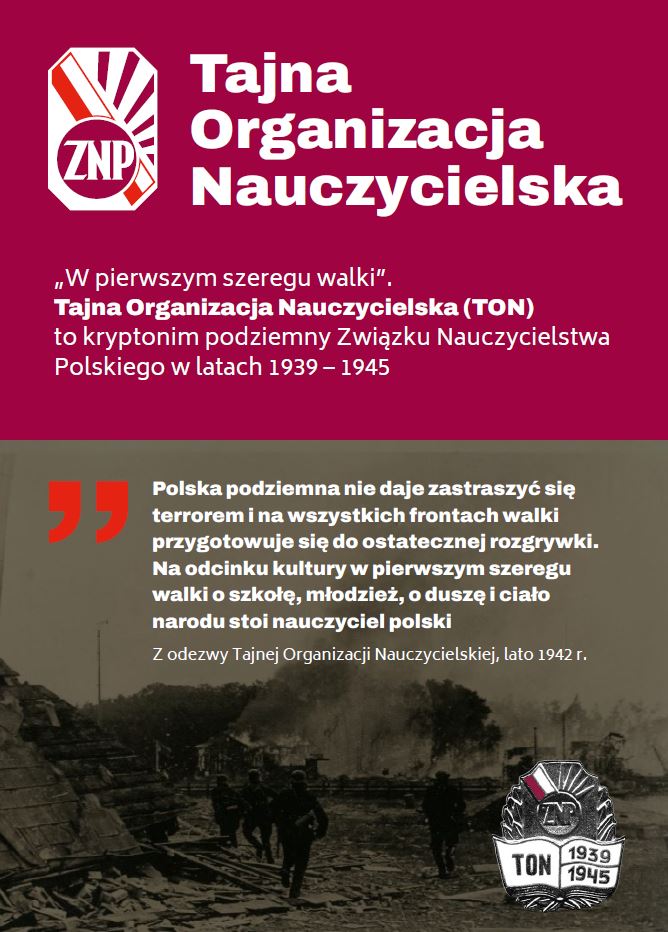 Prezes ZNP Sławomir Broniarz: Związek Nauczycielstwa Polskiego zapisał chwalebną kartę podczas II wojny światowej, kiedy przeszedł do działalności podziemnej pod kryptonimem Tajna Organizacja Nauczycielska. Wiele tysięcy nauczycieli tajnego nauczania zginęło, broniąc polskiej edukacji i ucząc młode pokolenia podczas okupacji. Tajna Organizacja Nauczycielska stanowi ewenement na skalę światową. Jesteśmy dumni z Nauczycieli i Nauczycielek prowadzących z narażeniem życia tajne nauczanie dzieci i młodzieży w czasie II wojny światowej!