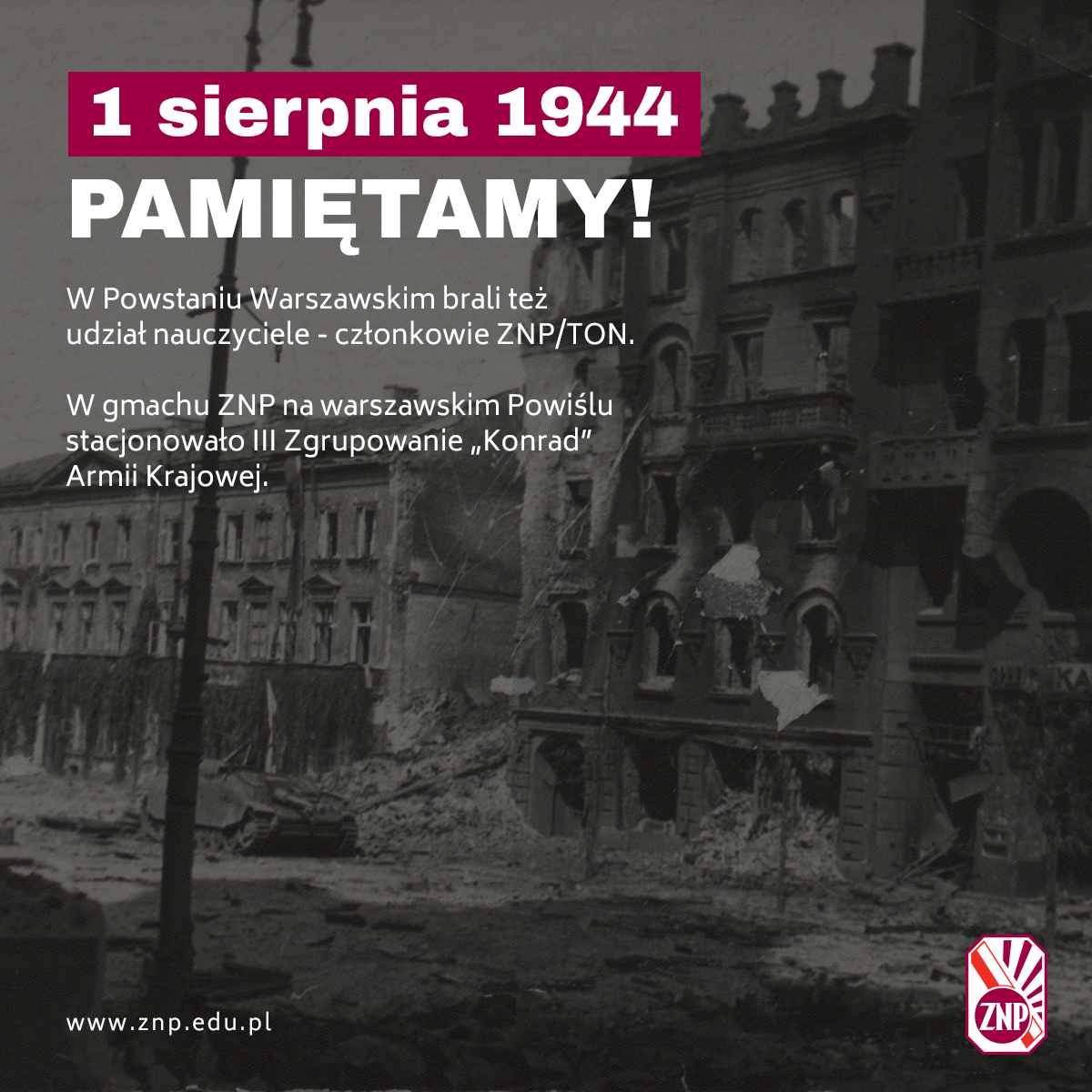 81. rocznica Powstania Warszawskiego. Jak co roku oddajemy hołd walczącym bohaterom i czcimy pamięć ofiar cywilnych. W Powstaniu Warszawskim brali też udział nauczyciele – członkowie ZNP/TON. W gmachu ZNP na warszawskim Powiślu stacjonowało III Zgrupowanie „Konrad” Armii Krajowej.
