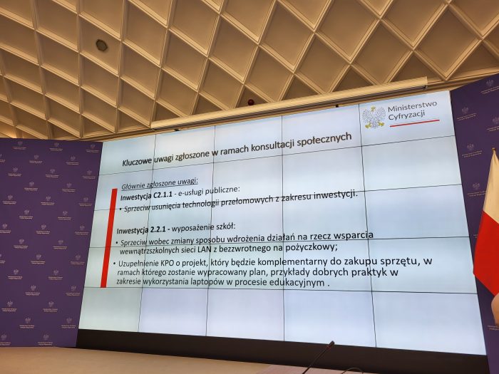 W konsultacjach zgłaszaliśmy też szereg wątpliwości na temat nowego projektu w KPO, który miał przeszkolić nauczycieli, którzy mieliby pełnić rolę Koordynatorów Cyfrowych w szkołach. Projekt ten z uwagi na wiele zastrzeżeń został wykreślony z realizacji z KPO.