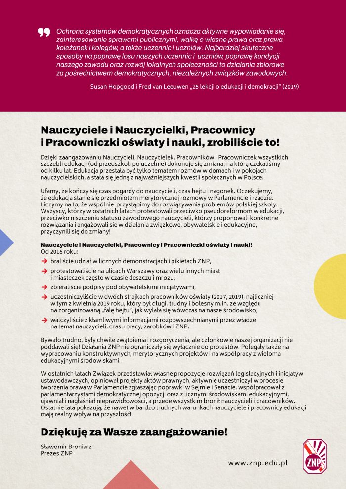 „Ochrona systemów demokratycznych oznacza aktywne wypowiadanie się, zainteresowanie sprawami publicznymi, walkę o własne prawa oraz prawa koleżanek i kolegów, a także uczennic i uczniów. Najbardziej skuteczne sposoby na poprawę losu naszych uczennic i uczniów, poprawę kondycji naszego zawodu oraz rozwój lokalnych społeczności to działania zbiorowe za pośrednictwem demokratycznych, niezależnych związków zawodowych”. Susan Hopgood i Fred van Leeuwen „25 lekcji o edukacji i demokracji” (2019)