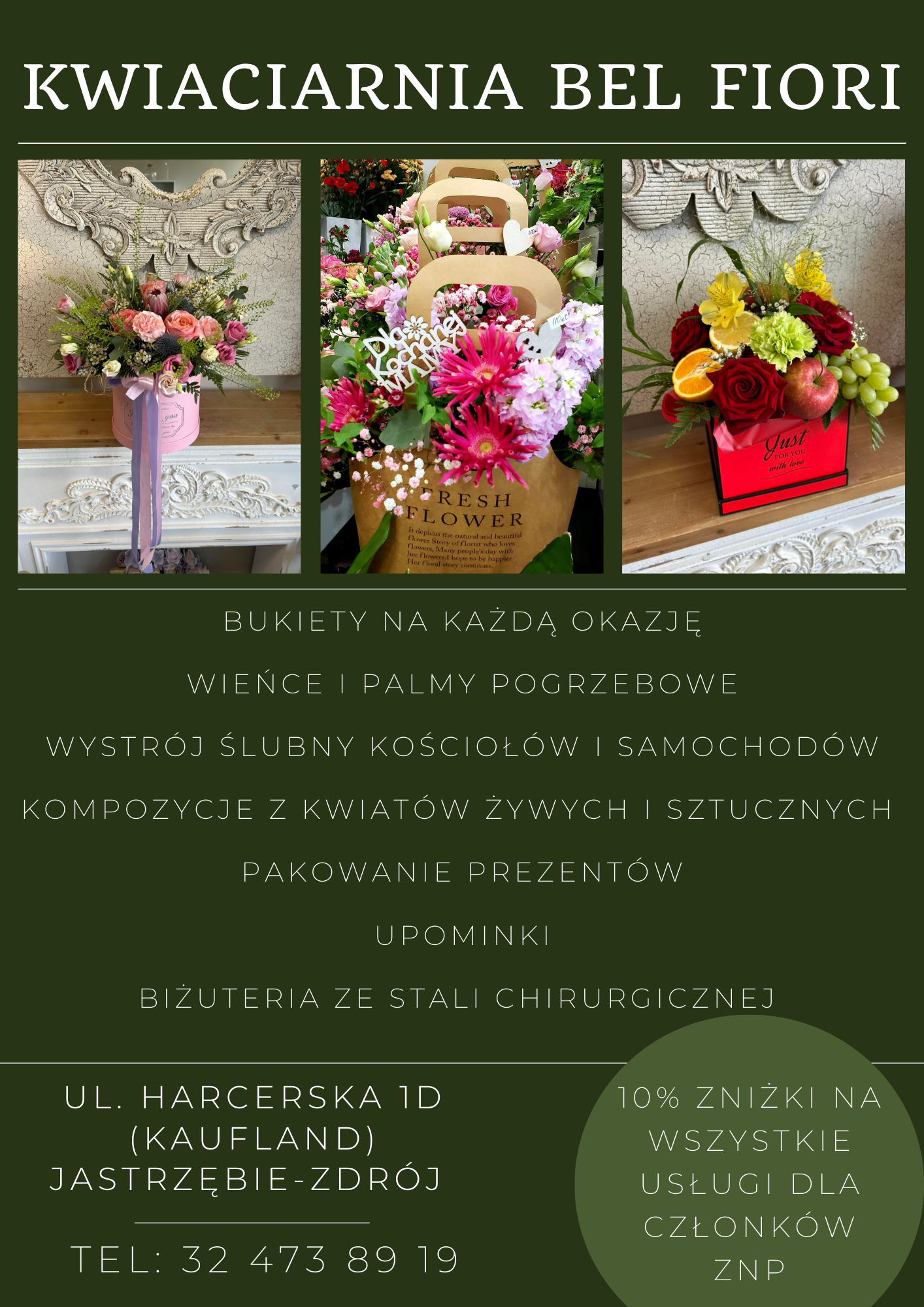 Kwiaciarnia znajduje się przy ulicy Harcerskiej 1D (market Kaufland) w Jastrzębiu-Zdroj