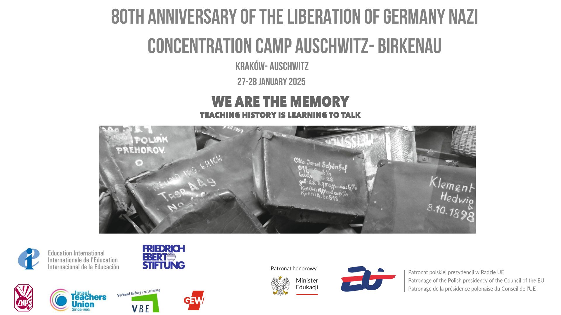 Międzynarodowa konferencja „My jesteśmy pamięcią. Nauczanie historii to nauka rozmowy” odbywa się 27 – 28 stycznia 2025 r. w 80. rocznicę wyzwolenia niemieckiego nazistowskiego obozu koncentracyjnego i zagłady Auschwitz-Birkenau.