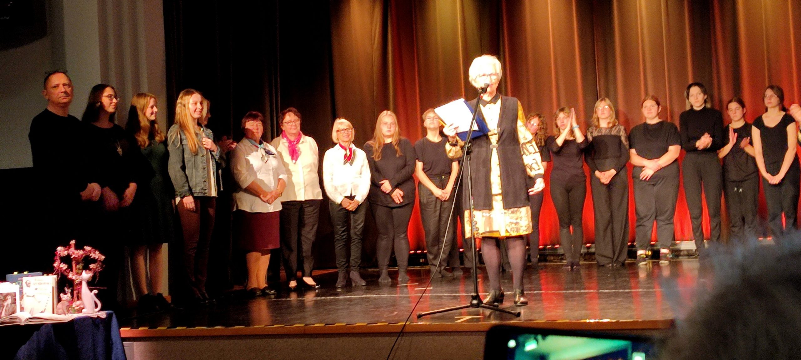 W piątek 20 października br., w Ligockiej Harcówce – Klubie Kultury Teatru Ziemi Rybnickiej, odbył się wyjątkowy spektakl słowno-muzyczny zatytułowany „Nic dwa razy się nie zdarza i nie zdarzy”, w którym wzięło udział wielu członków naszej Sekcji wraz z przewodniczącą. Spektakl przygotowali rybniccy słuchacze Uniwersytetu Trzeciego Wieku wraz z młodzieżą licealną, chcąc uczcić setną rocznicę urodzin naszej polskiej Poetki-Noblistki Wisławy Szymborskiej. Bieżący rok, decyzją Polskiego Senatu /uchwała z dnia 16 listopada 2022 r./ został ogłoszony Rokiem Wisławy Szymborskiej. W programie seniorzy UTW recytowali znane wiersze Szymborskiej, które komentowała dr Edyta Korepta wraz z panią Janiną Freud. Pantonima w wykonaniu licealistów z teatru „Kwestia gustu” pod kierunkiem pani Izabeli Karwot, ilustrowała żartobliwe gatunki literackie poetki. Szymborską w muzyce przedstawiły grupy muzyczne DK w Chwałowicach pod kierunkiem pana Jarosława Hanika. A wszystko to spowite było sentymentalnymi wspomnieniami o Poetce, relacjami z bezpośrednich kontaktów z Nią. Uzupełnieniem treści spektaklu były wyświetlane na monitorze kadry ukazujące samą Poetkę oraz najważniejsze wydarzenia – Wręczenie Nagrody Nobla, czy Orderu Orła Białego.