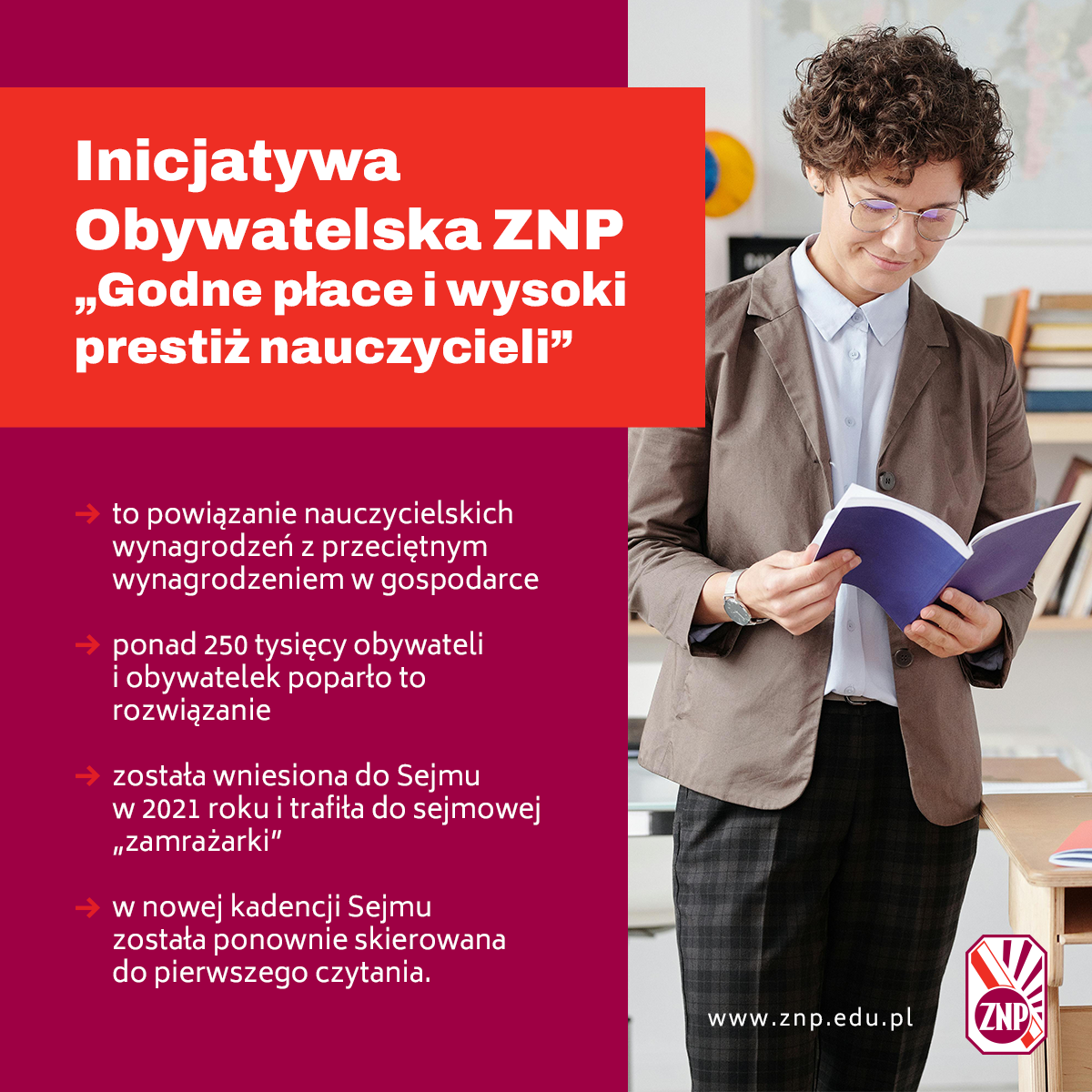 Inicjatywa ZNP została wniesiona do Sejmu w 2021 r. i trafiła do sejmowej „zamrażarki”, decyzją ówczesnej marszałek Elżbiety Witek (PiS). Dopiero w nowej kadencji Sejmu, inicjatywa została ponownie procedowana. Jej pierwsze czytanie odbyło się w styczniu 2024 roku.