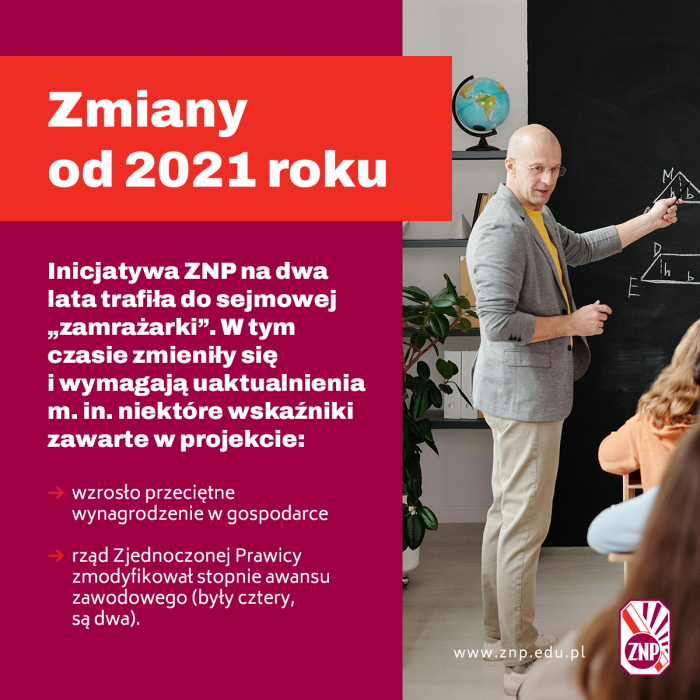 W ciągu dwóch lat zmieniła się również wysokość przeciętnego wynagrodzenia w gospodarce (było to 5 168 zł). Dodatkowo w chwili składania obywatelskiego projektu wynagrodzenie zasadnicze stażysty stanowiło 73 proc. wynagrodzenia nauczyciela dyplomowanego, a obecnie stanowi już 81 proc.
