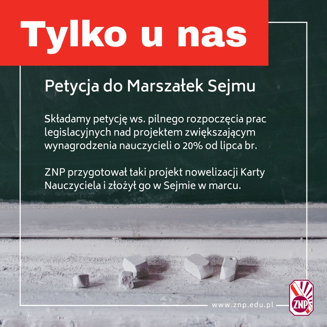 Na podstawie art. 2, art. 5 i art. 9 ustawy z 11 lipca 2014 r. o petycjach, Związek Nauczycielstwa Polskiego występuje do Marszałek Sejmu Rzeczypospolitej Polskiej o pilne skierowanie projektu ustawy o zmianie ustawy – Karta Nauczyciela oraz niektórych innych ustaw (EW-020-1178/23) do prac legislacyjnych w Parlamencie.