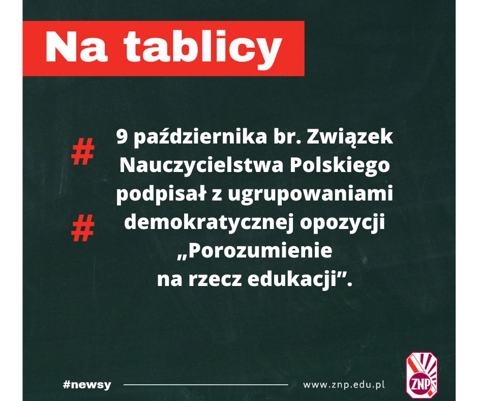 9 października 2023 r. Związek Nauczycielstwa Polskiego podpisał z ugrupowaniami demokratycznej opozycji „Porozumienie na rzecz edukacji”.