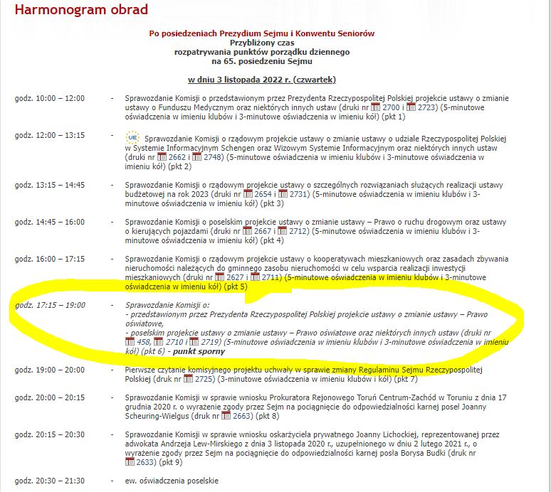 Kancelaria Sejmu opublikowała szczegółowy harmonogram posiedzenia zaplanowanego na 3 – 4 listopada br., a w nim debatę nad lex Czarnek.