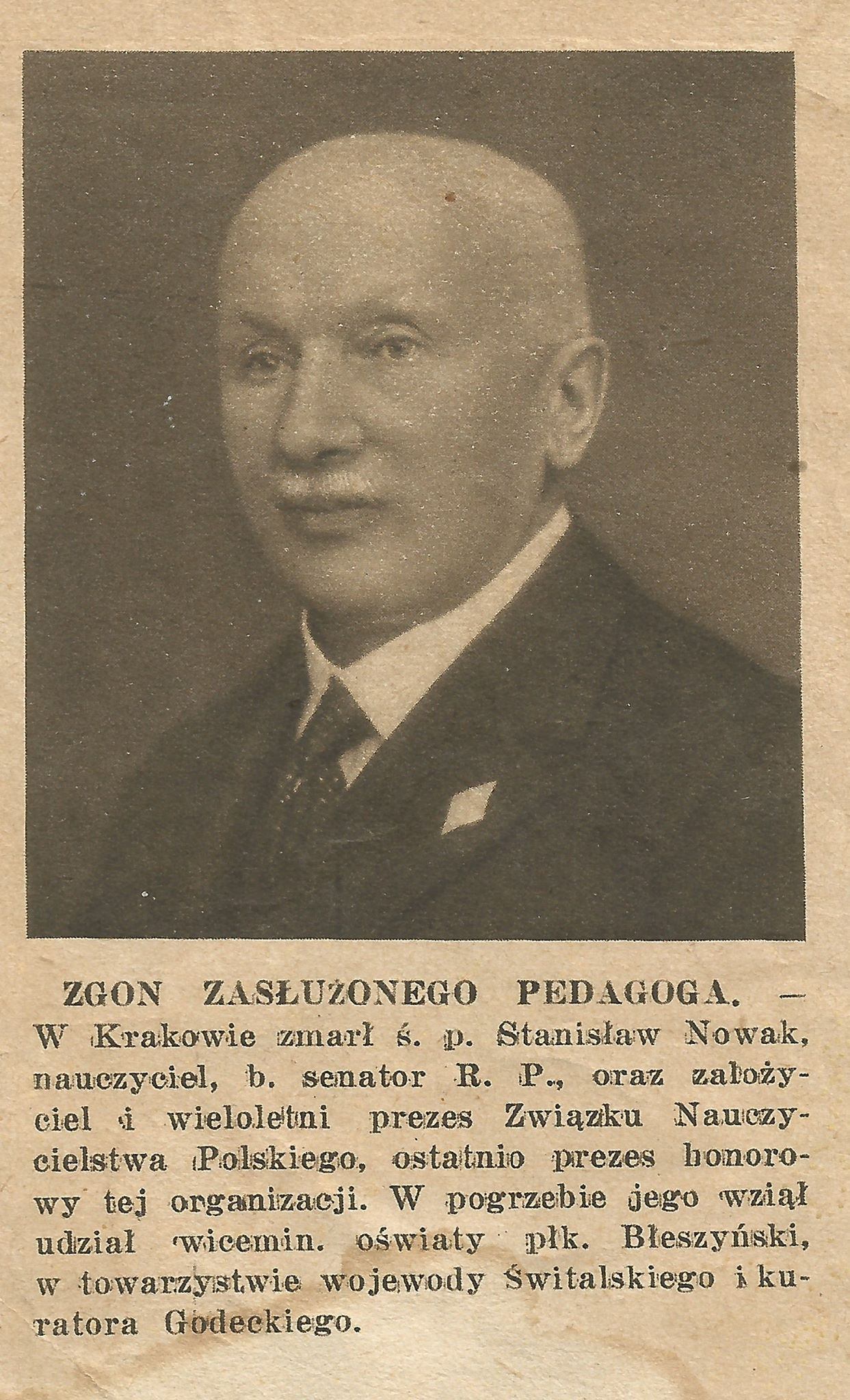 9 marca 1936 r. o godzinie 11 odbył się w Krakowie pogrzeb Stanisława Nowaka (1859-1936) zmarłego 6 marca, pierwszego prezesa ZNP, jego współtwórcy, Piłsudczyka, Radnego Miasta Krakowa (1905-1930), Senatora II RP (1922-1936), współtwórcy Związku Nauczycielstwa Słowiańskiego (1908), którego był prezesem od 1912 r., członka Polskiego Skarbu Wojskowego, Naczelnego Komitetu Narodowego. Szefa związku, który wsparł tworzenie legionów, a w 1920 roku wydał odezwę do nauczycielstwa, aby na ochotnika zgłaszało się do wojska w obronie ojczyzny oraz oddał za zgodą zarządu, cały skarb nauczycielski wraz z majątkiem do dyspozycji Józefa Piłsudskiego na potrzeby obrony kraju. Kawaler Krzyża Komandorskiego Orderu Odrodzenia Polski i Orderu św. Sawy. Spoczął na cmentarzu Rakowickim w Krakowie. Pogrzeb miał charakter państwowy i był ważnym wydarzeniem w Krakowie. Uczestniczył w nim m.in. wiceminister oświaty oraz wojewoda krakowski.