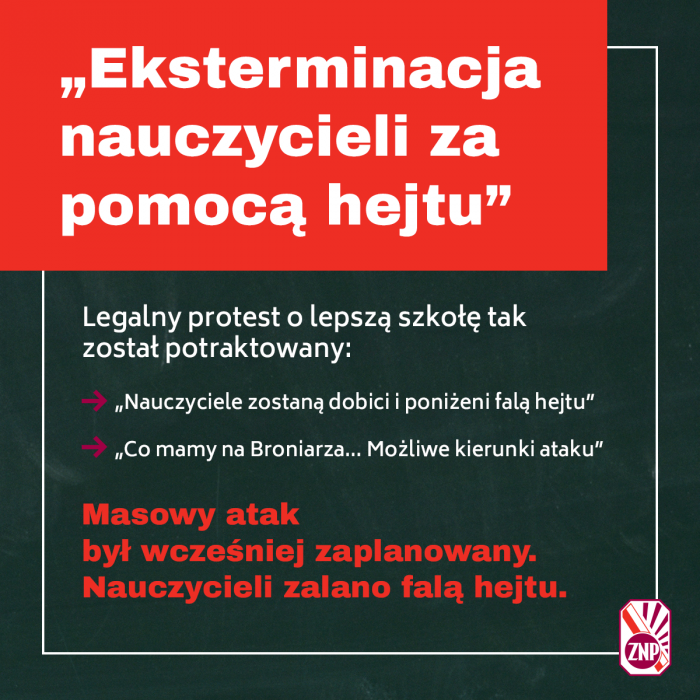 Zaatakowani zostali nauczyciele, związek zawodowy i jego przedstawiciele, przedstawiciele Rady Dialogu Społecznego i międzynarodowych organizacji zrzeszających związki zawodowe, których ZNP jest członkiem. Dlatego o sprawie poinformujemy:
