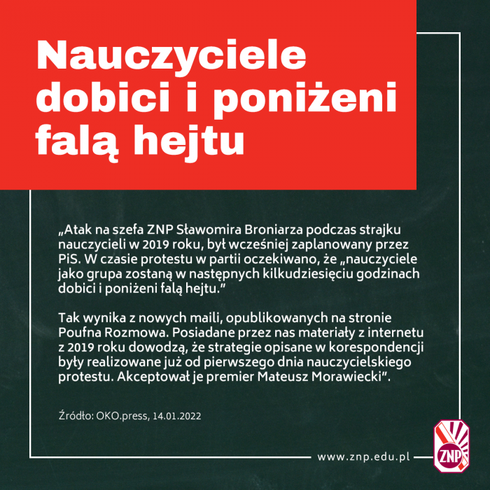 Jeśli w tym czasie strategia rządu polegała na – tu cytat: „dobiciu i poniżeniu nauczycieli za pomocą hejtu” – to mamy do czynienia z bezprecedensową sytuacją, złamaniem podstawowych zasad dialogu społecznego.