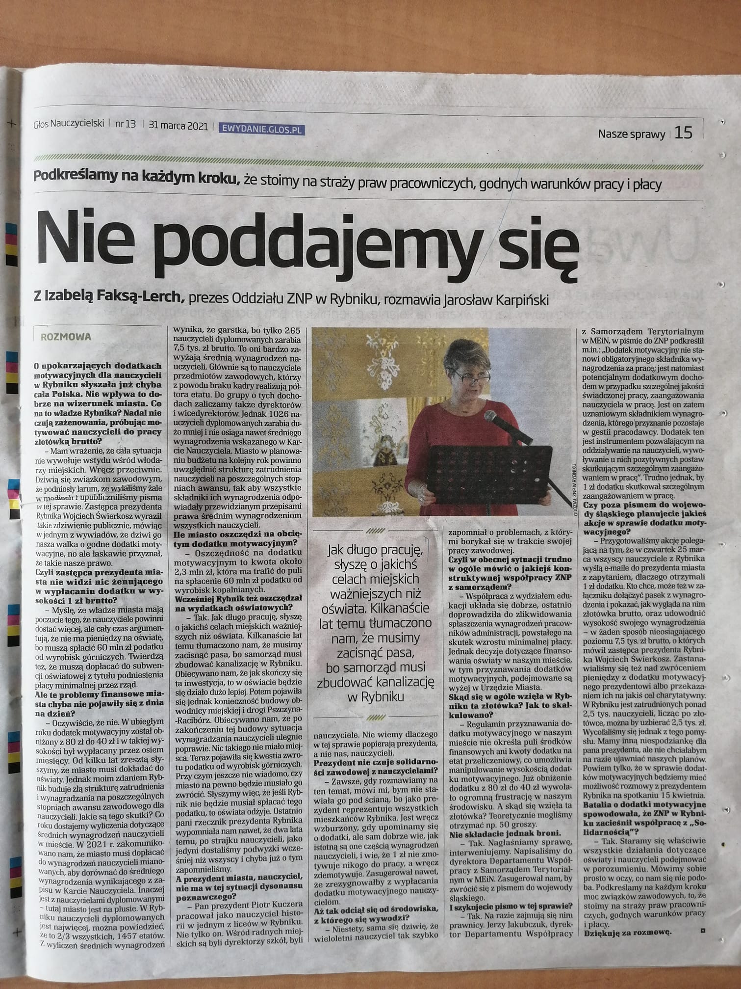 Czytamy w Głosie: „Nie ma przełomu po spotkania związków zawodowych z władzami miasta na temat urągających dodatków motywacyjnych dla nauczycieli, które w Rybniku od stycznia wynoszą 1 złotych brutto. – Nie posunęliśmy się ani o krok w kierunku porozumienia – relacjonuje w rozmowie z Głosem Izabela Faksa-Lerch, prezes Oddziału ZNP w Rybniku.
