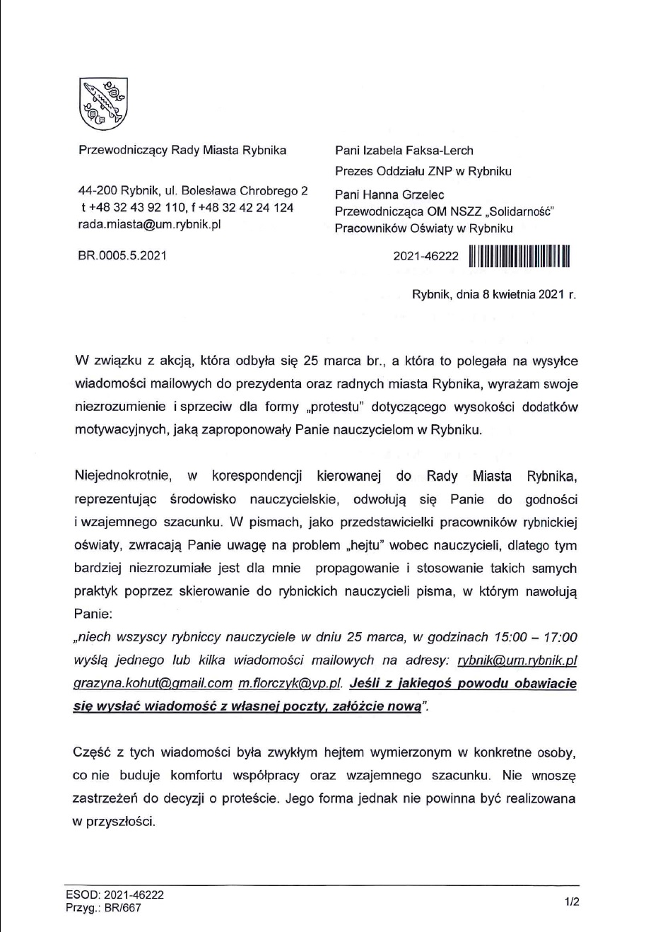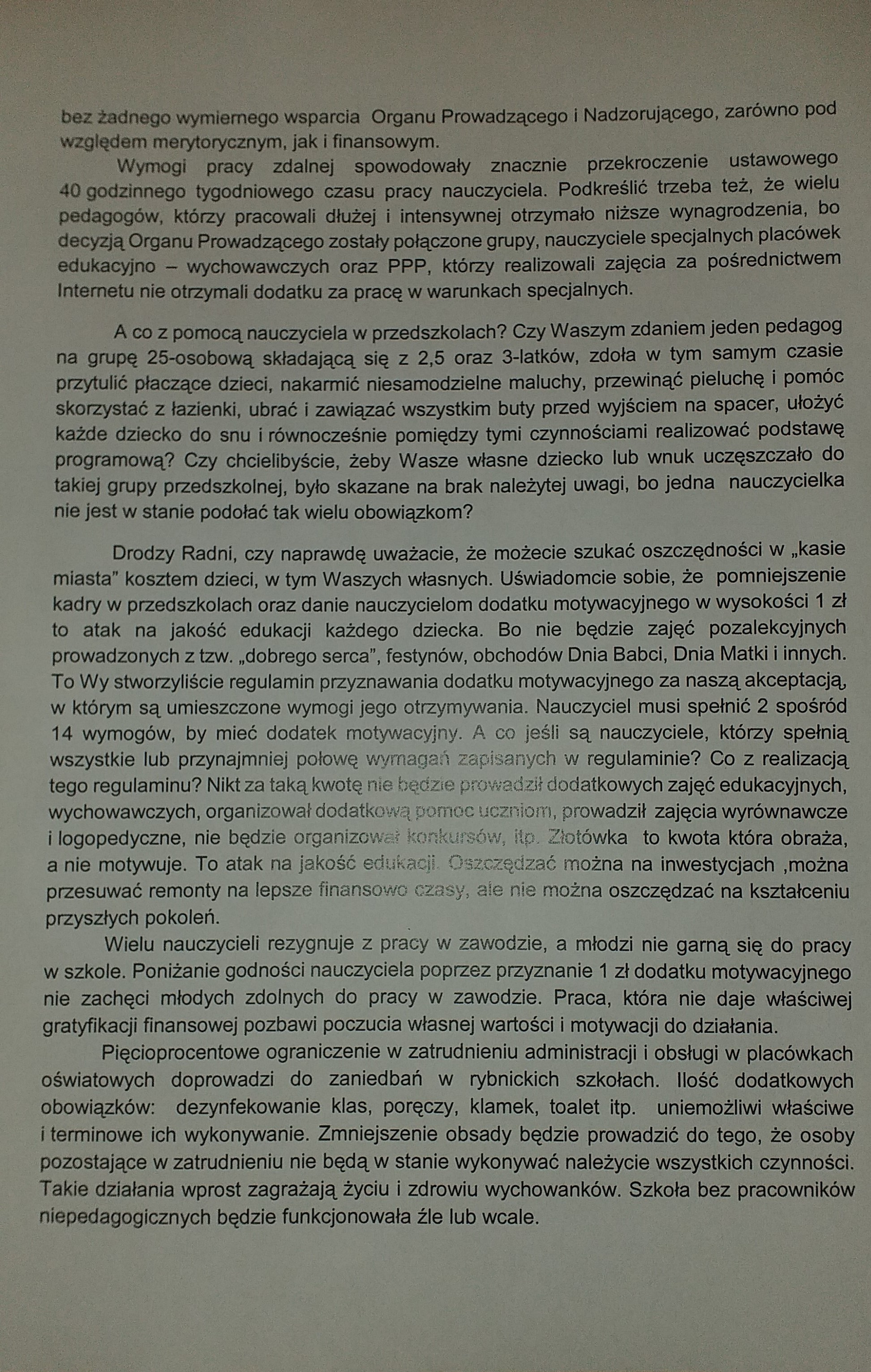 Pismo złożone na ręce Przewodniczącego Rady Miasta Rybnika –