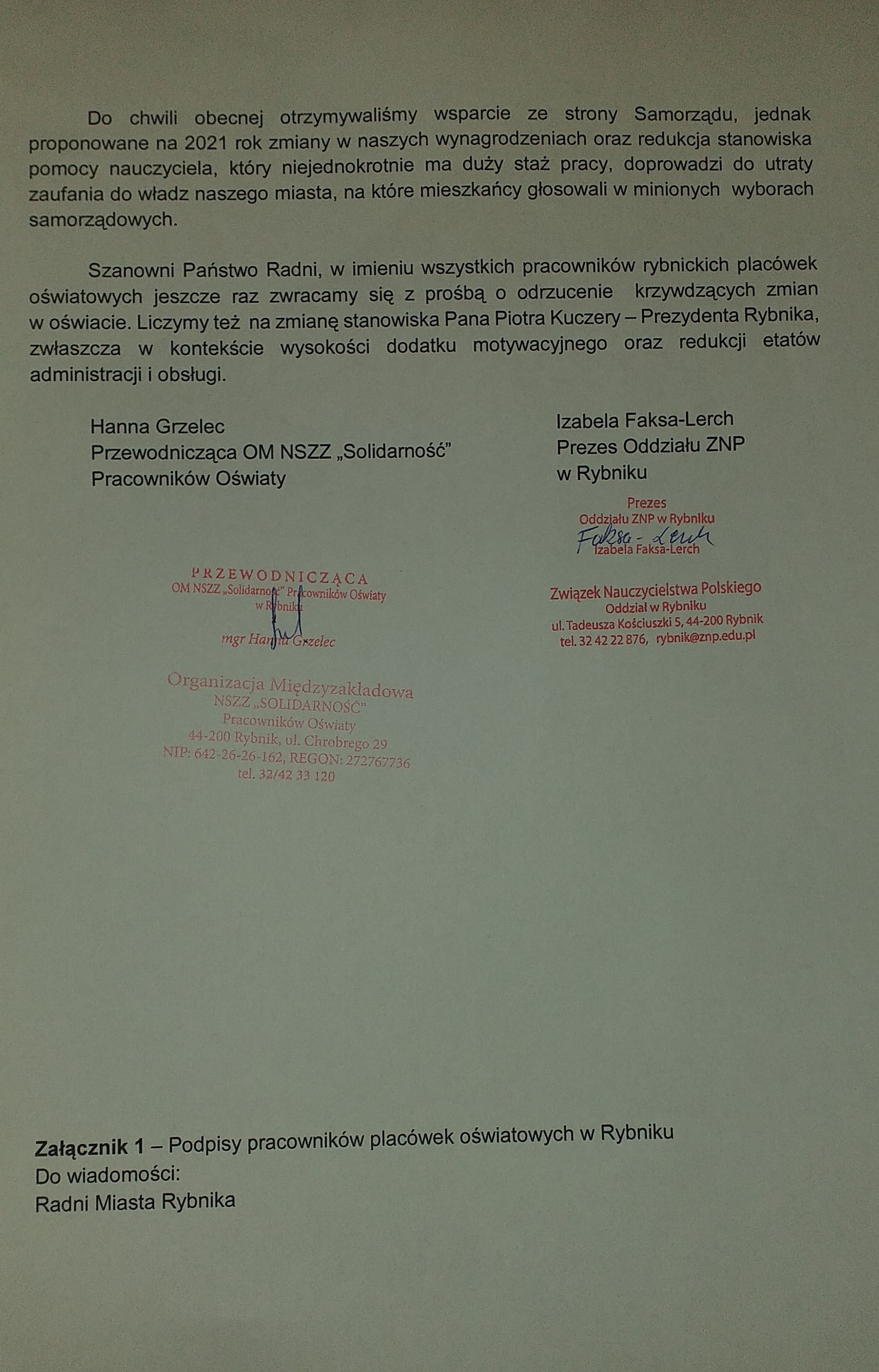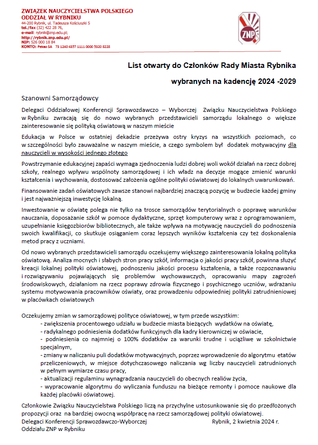 Kolejne pismo Zarządu Oddziału ZNP w Rybniku