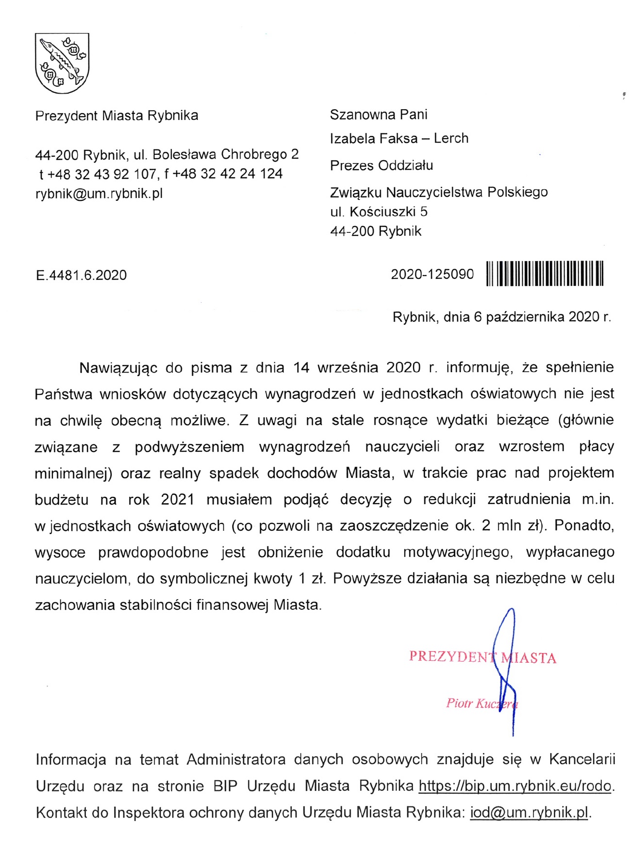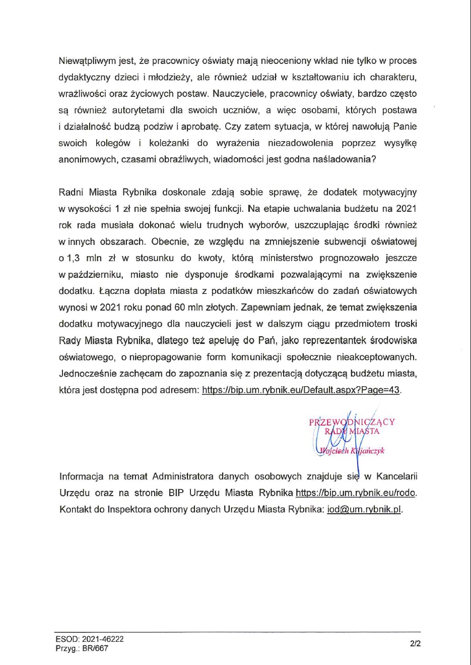 Odpowiedź na nasze pismo Prezydenta Miasta Rybnika p. Piotra Kuczera