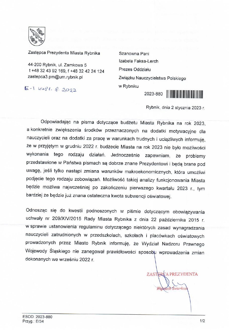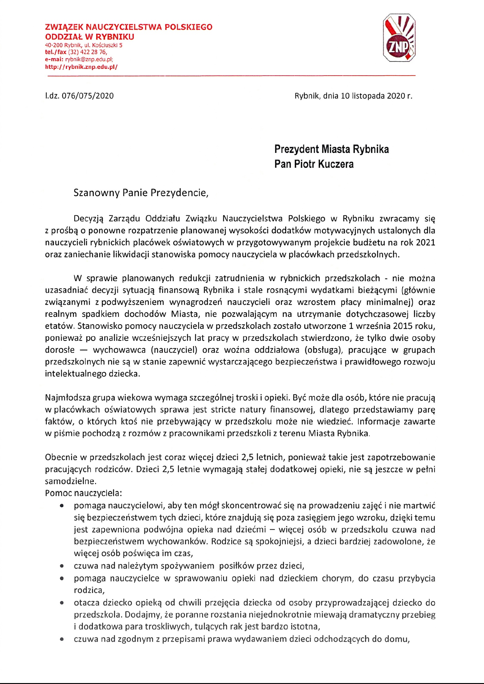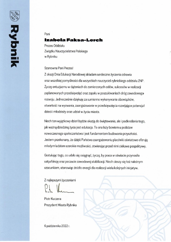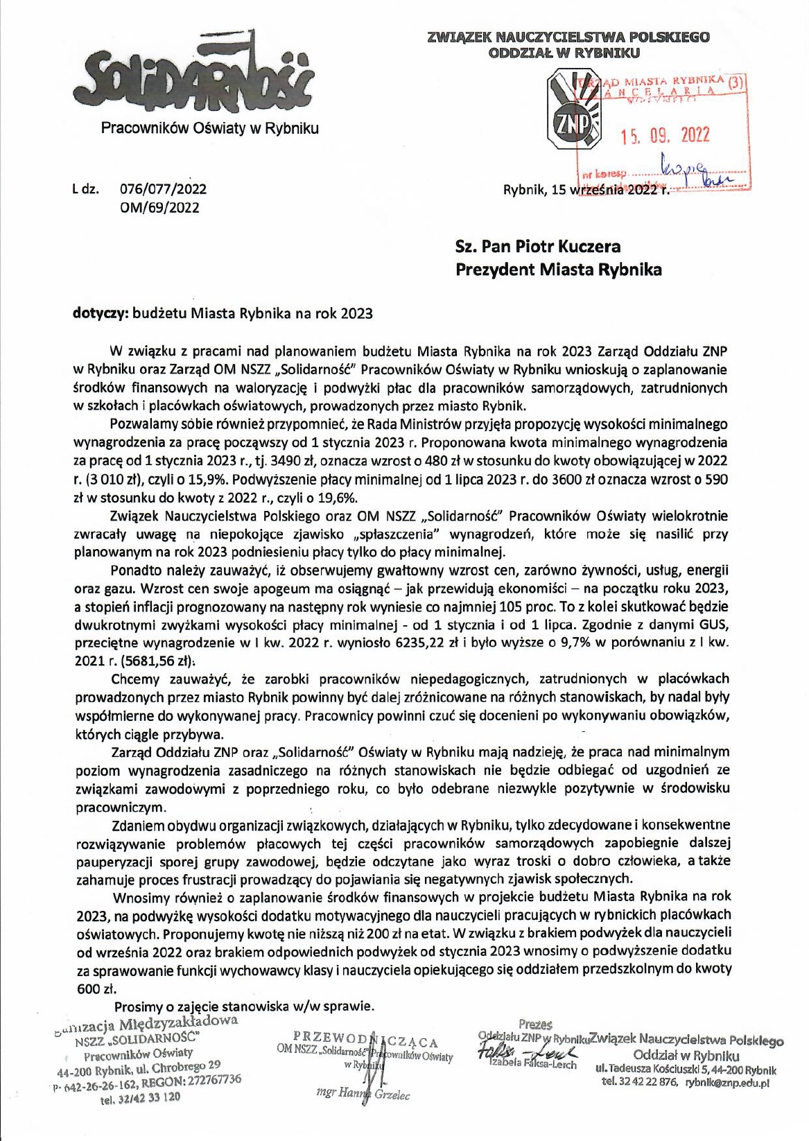 Pismo ZNP do Prezydenta Miasta Rybnika w sprawie planowanego budżetu na rok 2023.