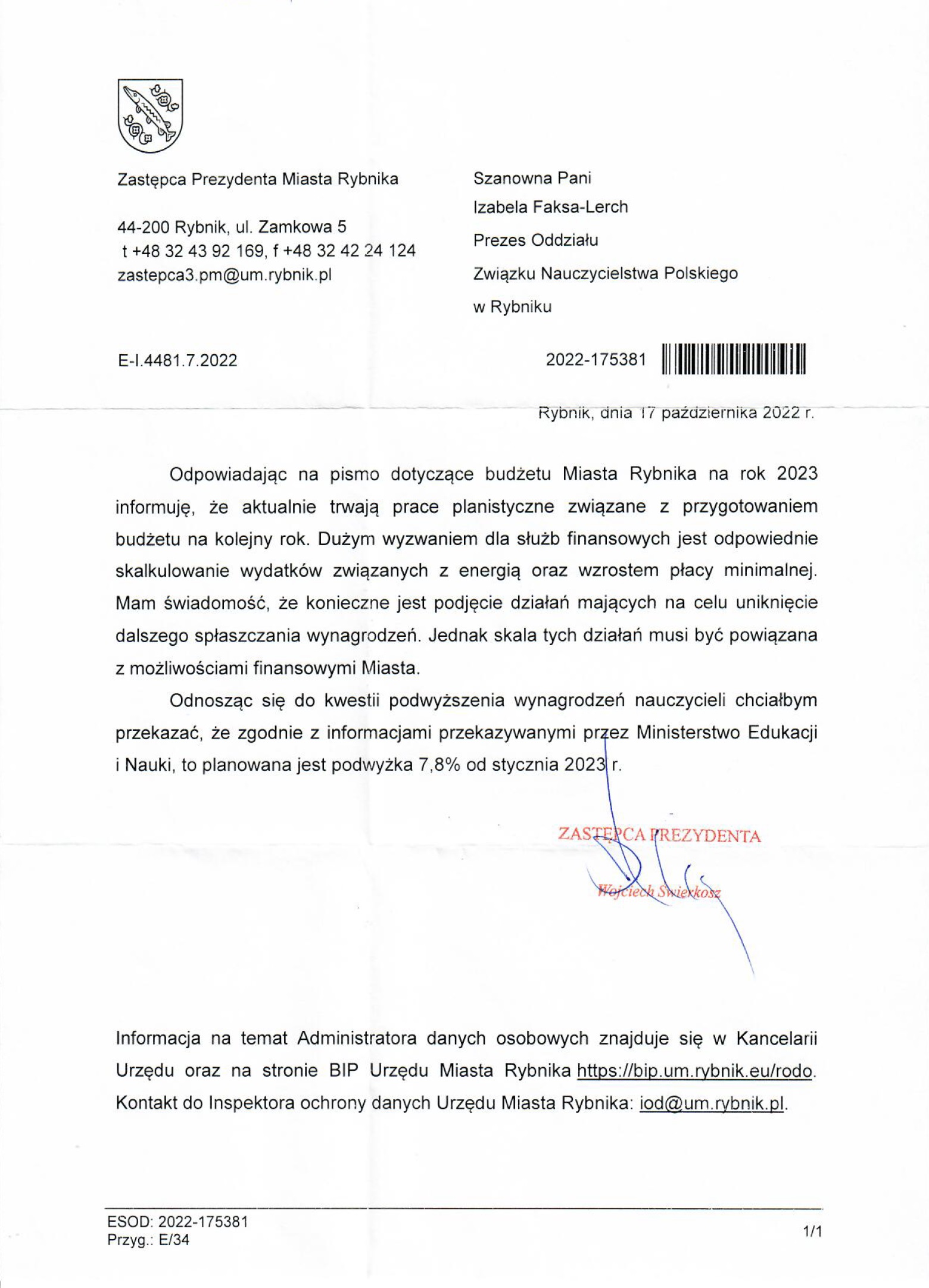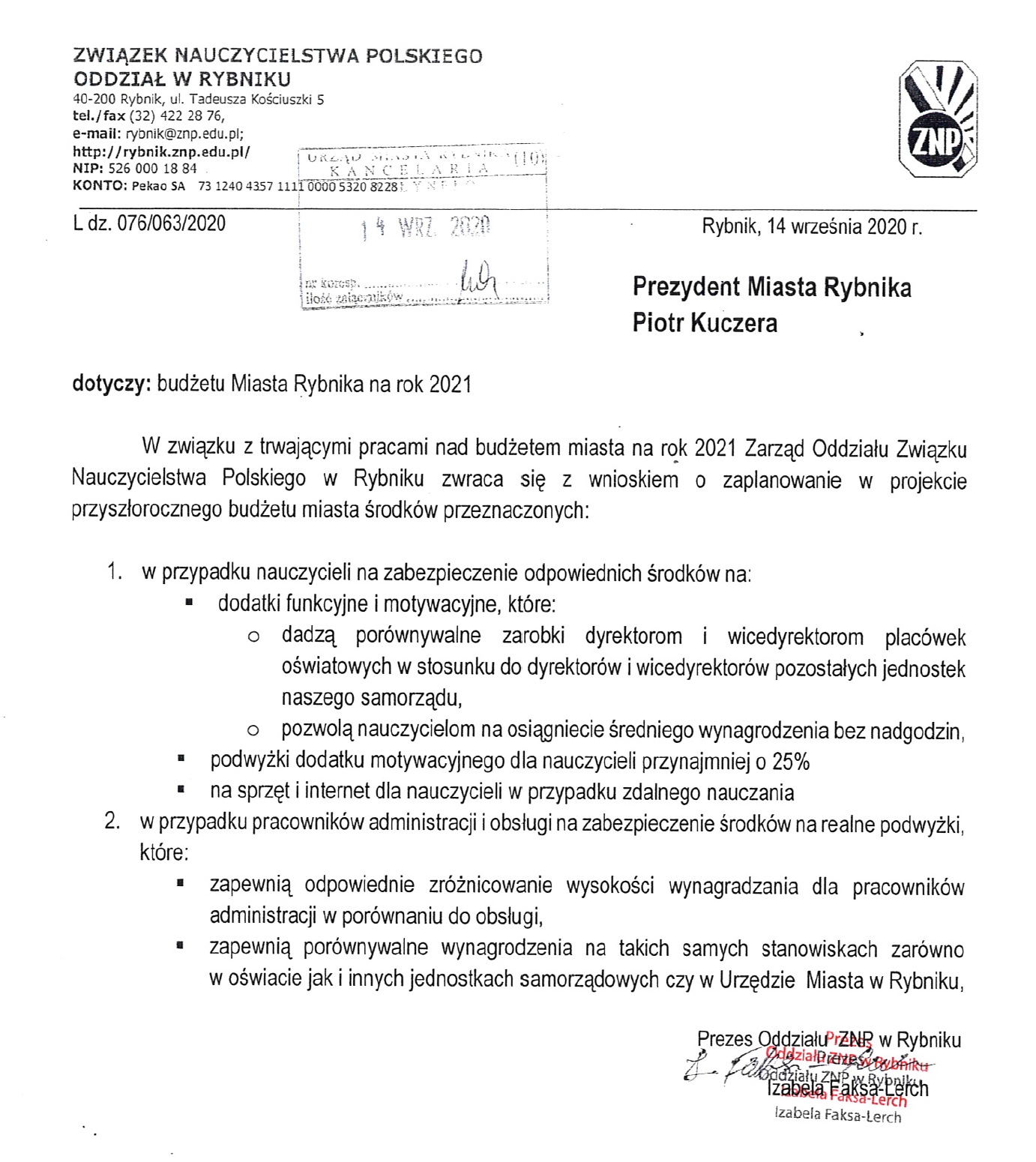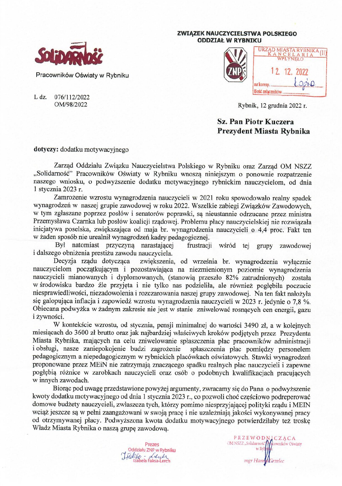 Pismo ZNP do Prezydenta Miasta Rybnika w sprawie planowanego budżetu na rok 2023.