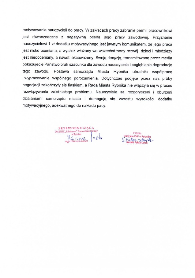 Dodatek motywacyjny to gorący temat wśród rybnickich nauczycieli. W ubiegłym roku dodatek został obniżony z 80 zł na 40 zł i w takiej wysokości był wypłacany przez 8 miesięcy. W tym roku ma to być upokarzające 1 złotych brutto. ZNP razem z oświatową „Solidarnością” planują już wspólną akcję. Jednym z pomysłów jest zwrócenie tych środków do miejskiej kasy albo przekazanie na cel charytatywny.