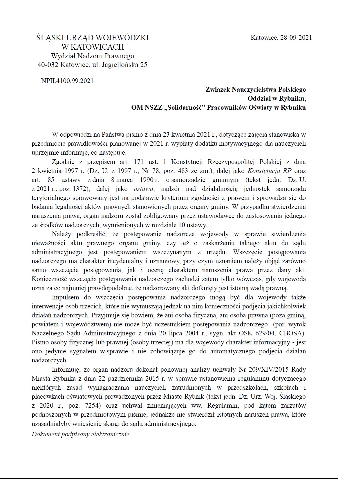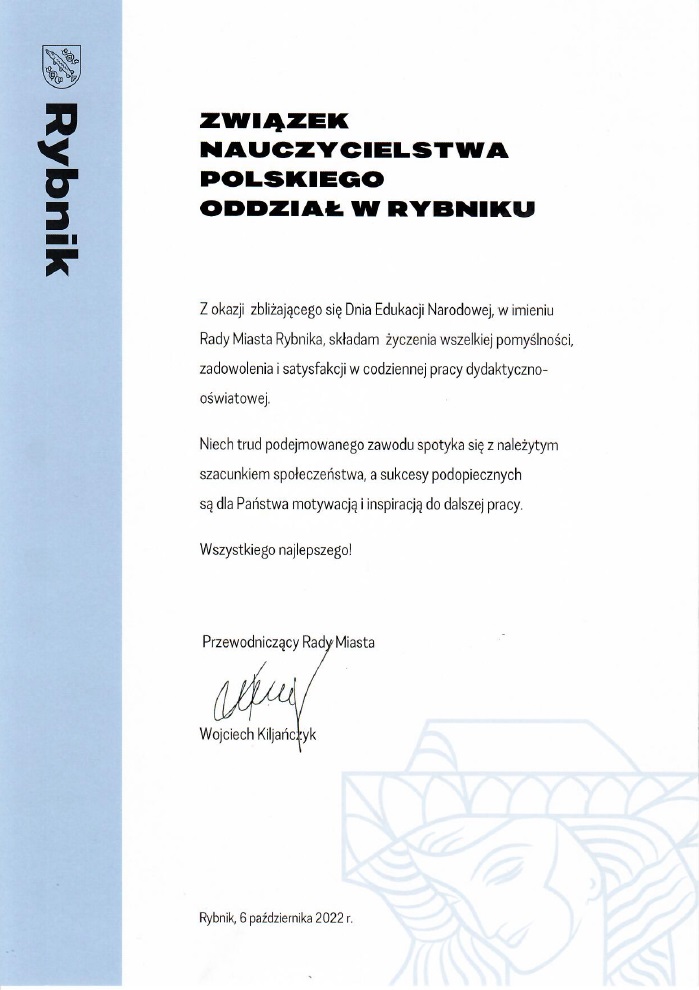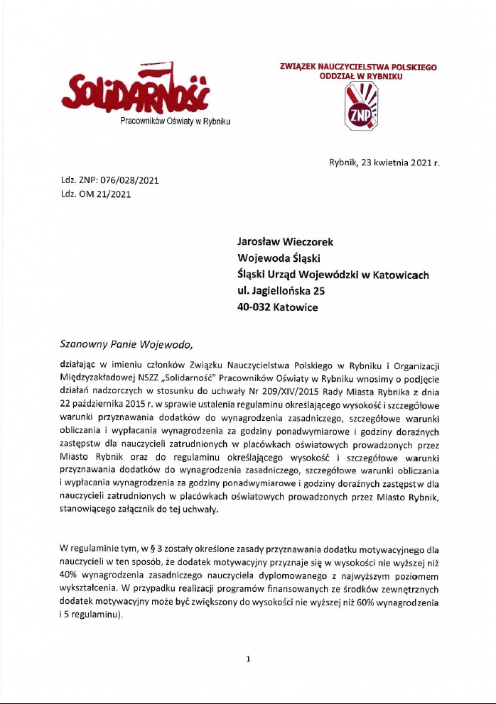 i nasza na pismo odpowiedź Zarządu Oddziału ZNP w Rybniku