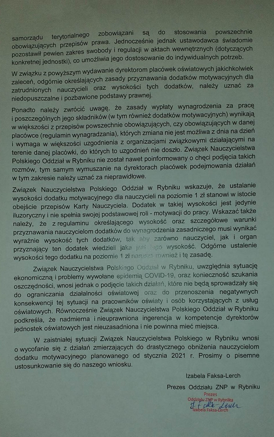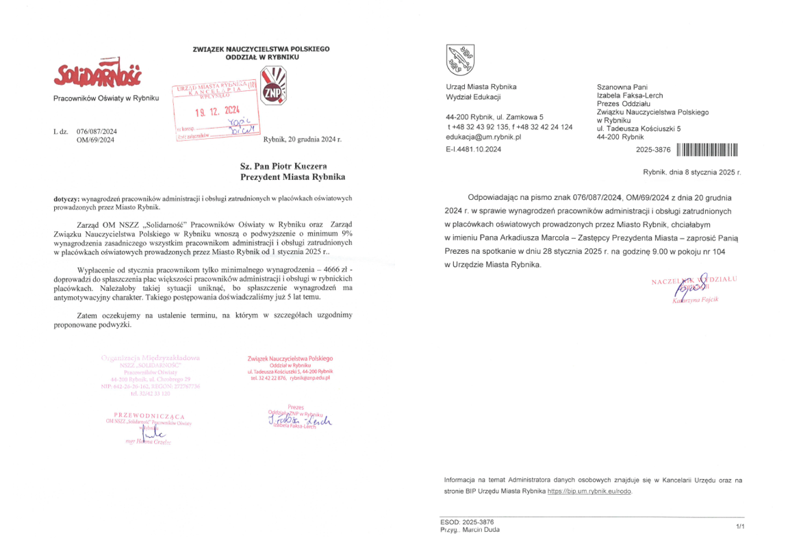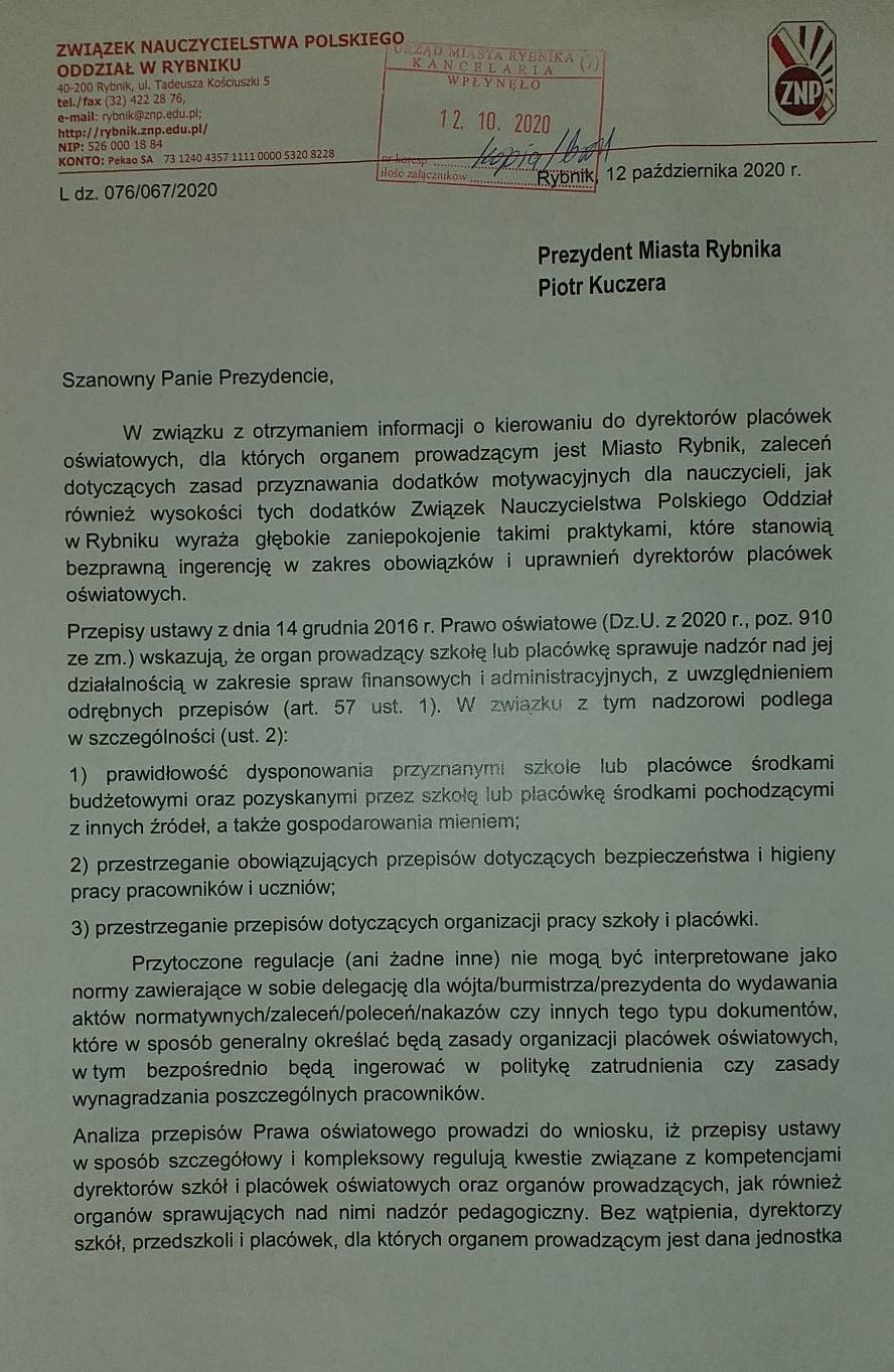 Rybnicki ZNP opublikował na Facebooku ostatnią korespondencję z magistratem w sprawie oszczędności na dodatku motywacyjnym. Pisma można przeczytać tutaj.