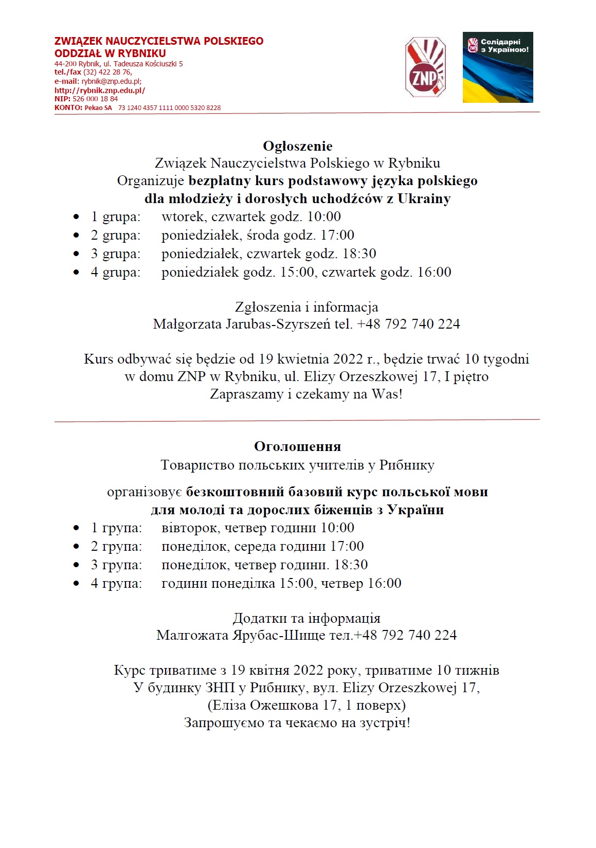 biuro Oddziału ZNP w Rybniku – NIECZYNNE