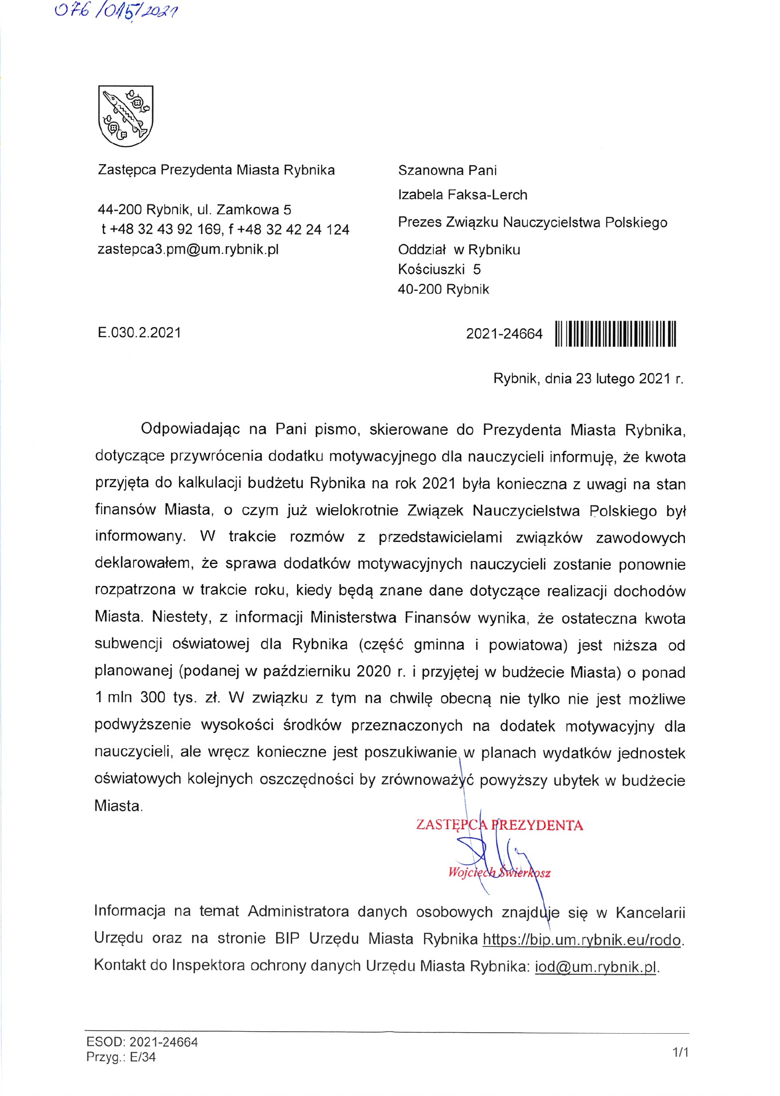 /Odpowiedź Zastępcy Prezydenta Miasta Rybnika