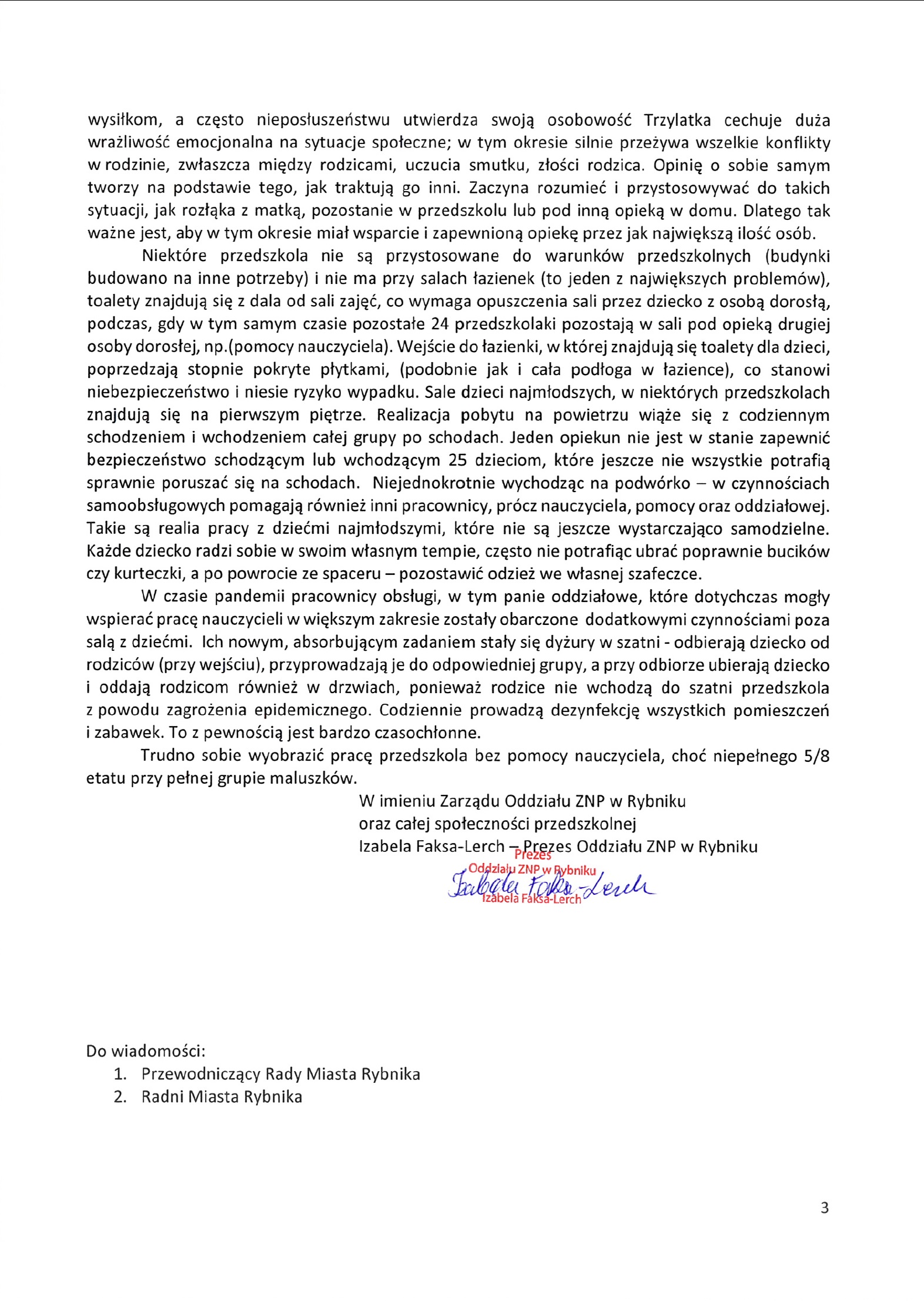 Od października już trzykrotnie apelowaliśmy do miasta o przyznanie godnych dodatków motywacyjnych dla nauczycieli, ale nic się nie zmieniło. W ostatnim piśmie z połowy lutego zarząd oddziału wypunktował za co nauczycielom należą się te dodatki. Chcieliśmy uświadomić wszystkim decydentom, że podczas zdanej nauki nauczyciele ciężko pracują i ten dodatek im się po prostu należy. W piśmie przytoczyłam zakres czynności dodatkowych nauczycieli wykonywanych przez ostatnie trzy miesiące. Szczególnie dotknięci zwiększeniem zakresu obowiązków służbowych zostali pracownicy pedagogiczni rybnickich przedszkoli.