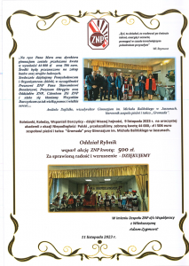Podziękowanie za wsparcie od zespołu Dziecięcego Zespołu Pieśni i Tańca „Gromada” działającego przy Gimnazjum im. Michała Balińskiego w Jaszunach.
