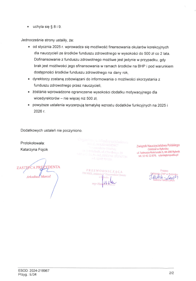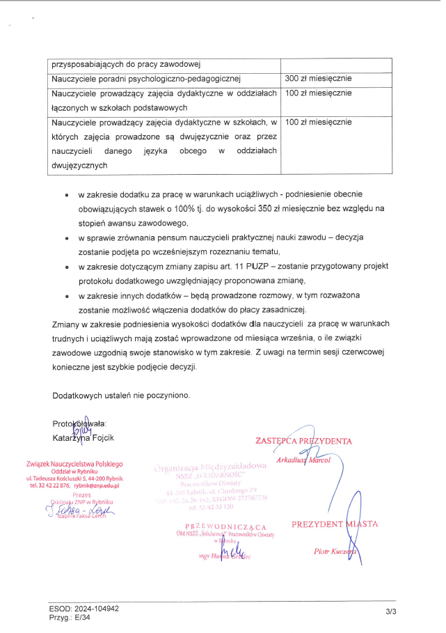 Protokół z uzgodnień pomiędzy związkami zawodowym a Urzędem Miasta Rybnika