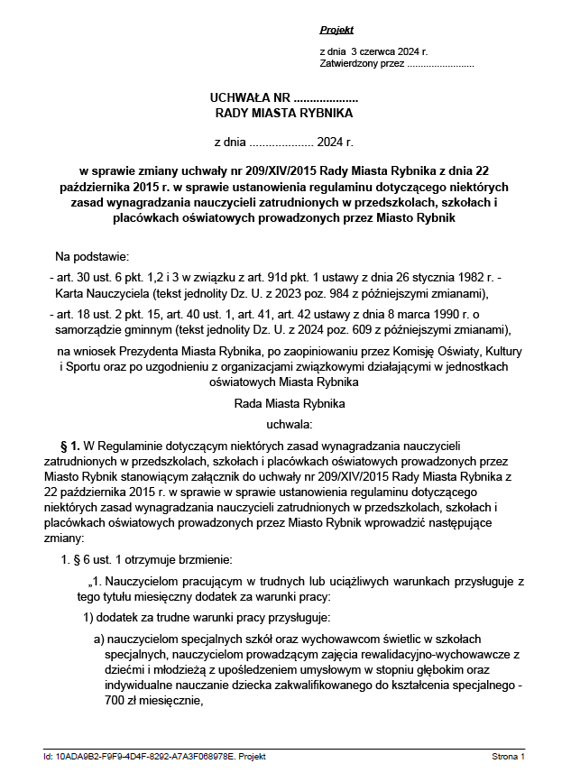 Projekt Uchwały Rady Miasta Rybnika nr 209 z 3 czerwca 2024 r. (po uzgodnieniach)