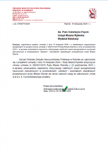 Opinia ZNP do projektu Uchwały z dnia 15 listopada 2024 r. Rady Miasta Rybnika zmieniającej uchwałę nr 209/XIV/2015 r.