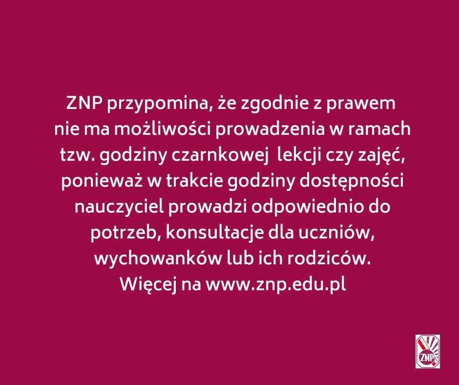 Związek Nauczycielstw Polskiego przypomina, że zgodnie z prawem nie ma możliwości, by w ramach tzw. godziny czarnkowej prowadzone były lekcje czy zajęcia, ponieważ w trakcie godziny dostępności nauczyciel prowadzi – odpowiednio do potrzeb – konsultacje dla uczniów, wychowanków lub ich rodziców.