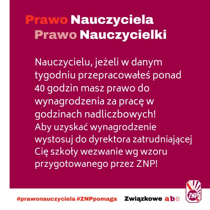 Nauczycielu, jeżeli w danym tygodniu przepracowałeś ponad 40 godzin, masz prawo do wynagrodzenia za pracę w godzinach nadliczbowych!