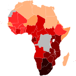 Według danych z 2022 r. Afrykę zamieszkuje 1 450 000 000 osób, co stanowi około 1/5 ludności świata[3]. Afryka ma najwyższy na świecie przyrost naturalny (24‰ rocznie) i jest „najmłodszym” kontynentem na Ziemi – dzieci (0–14 lat) stanowią ok. 44% populacji. Afryka ma też najniższy PKB na 1 mieszkańca (895 dolarów USA), najniższą średnią długość życia (56 lat[4]), a także największą liczbę zakażonych wirusem HIV (ok. 24,9 mln, czyli ok. 64,3% zakażonych na całym świecie).