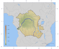 - Znajduje się w centralnej Afryce. Jest obniżeniem pomiędzy wzniesieniami środkowoafrykańskimi, wzniesieniami tanganicko-rodezyjskimi, tarczą Kasai i wzniesieniami kongijsko-nambijskimi. Jej obszar tworzy jednostkę fizycznogeograficzną Kotlina Konga[14]. Znajduje się na terytorium Demokratycznej Republiki Konga[21].