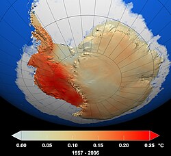 [edytuj | edytuj kod]Najniższa zarejestrowana przez człowieka temperatura naturalnie występująca na Ziemi, −89,2 °C, została stwierdzona 21 lipca 1983 na radzieckiej (obecnie rosyjskiej) stacji polarnej Wostok[a][80][43]. Jeszcze niższe temperatury, sięgające −93,2 °C, są znane z obserwacji satelitarnych[81]. Najcieplejszym miesiącem jest styczeń z temperaturą minimalną −30 °C, natomiast najchłodniejszy jest sierpień, z temperaturami spadającymi do −70 °C. Na wybrzeżu temperatury są wyższe, przy północnych krańcach Półwyspu Antarktycznego mogą sięgać powyżej 0 °C. Najniższa średnia temperatura stycznia w miejscu stale zamieszkanym przez ludzi wynosi −33 °C (stacja Wostok)[82]. Najwyższą temperaturę na Antarktydzie, 18,3 °C zanotowano 6 lutego 2020 w stacji Esperanza na Półwyspie Antarktycznym; poprzedni rekord (17,5 °C) odnotowano także w tym miejscu w marcu 2015. Półwysep Antarktyczny należy do najszybciej ocieplających się obszarów globu, temperatura wzrosła tam o 3 °C od lat 1970. do początku lat 2020.[43][83].