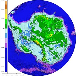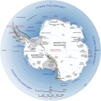 Antarktyda – kontynent położony najdalej na południe Ziemi, na którym znajduje się geograficzny biegun południowy[4]. Jest położony w rejonie Antarktyki na półkuli południowej, niemal w całości na południe od koła podbiegunowego i otoczony przez Ocean Południowy. Ma powierzchnię 14,2 mln km², jest piątym co do wielkości kontynentem po Azji, Afryce, Ameryce Północnej i Ameryce Południowej, prawie dwa razy większym od Australii. Około 98% Antarktydy pokrywa polarna czapa lodowa o średniej grubości 1,9 km, która rozciąga się do wszystkich, prócz wysuniętych najbardziej na północ krańców Półwyspu Antarktycznego.