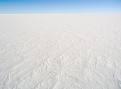 [edytuj | edytuj kod]Zachmurzenie we wnętrzu kontynentu Antarktydy jest mniejsze niż w Arktyce, przez 45–65% dni w roku niebo jest zachmurzone w mniej niż 50%. Wybrzeże jest znacznie bardziej zachmurzone niż wnętrze kontynentu. Opady występują prawie wyłącznie pod postacią stałą (śnieg lub grad), deszcze zdarzają się bardzo rzadko i tylko podczas lata na wybrzeżach[84]. Wnętrze Antarktydy jest lodową pustynią z niewielką ilością opadów, średnio poniżej 100 mm rocznie[64]; w pobliżu wybrzeży opady są większe, osiągając typowo 200 mm w skali roku[85]. Na stacji polarnej Amundsen-Scott na biegunie południowym spadają zaledwie 2 milimetry śniegu na rok; pod koniec lat 90. XX wieku na wybrzeżach zarejestrowano rekordowe opady przekraczające 800 mm w skali roku[43].