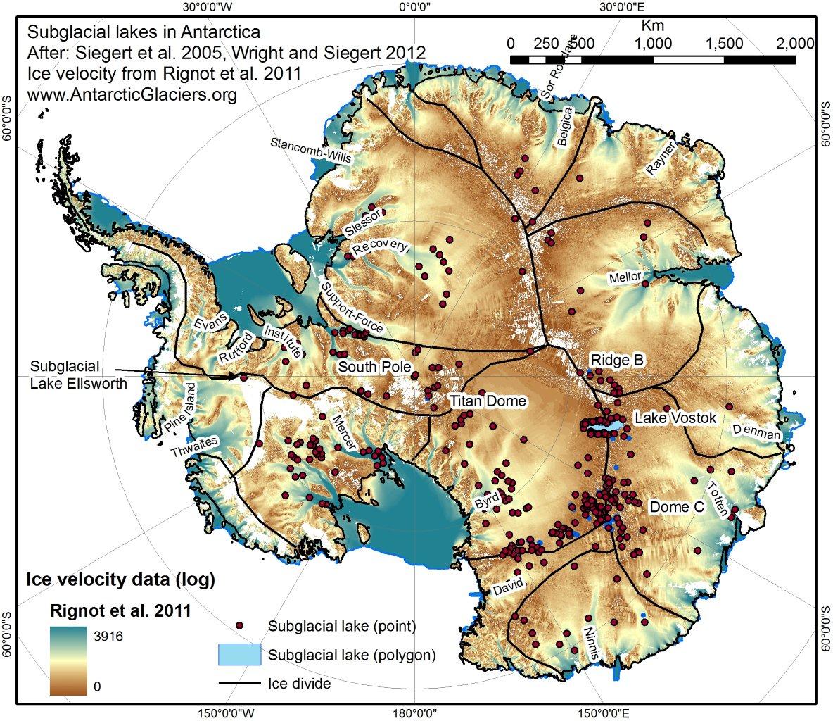 U podstawy antarktydzkiej pokrywy lodowej w niektórych miejscach znajdują się jeziora podlodowcowe. W 2013 było znanych 387 takich zbiorników; liczba ta rośnie w miarę postępu badań. Największym z nich jest jezioro Wostok o powierzchni około 16 tysięcy km², co czyni je jednym z największych jezior na Ziemi; zostało ono odkryte pod rosyjską stacją polarną Wostok w 1996[52][53]. Dawniej sądzono, że od 500 000 do miliona lat musi być ono całkowicie odizolowane od wpływów zewnętrznych; obserwacje pokrywy lodowcowej wykazały jednak, że między przynajmniej niektórymi jeziorami podlodowcowymi występują duże przepływy wody[54].