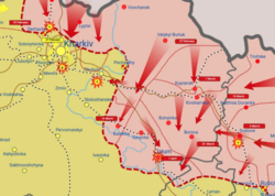 [edytuj | edytuj kod]Na tereny separatystycznych republik donieckiej i ługańskiej weszła rosyjska 8 Armia Gwardii, która miała nacierać na południowy wschód, w stronę Mariupola[47]. Jej główne oddziały stanowiły: 150 Idrycko-Berlińska Dywizja Zmechanizowana i 20 Przykarpacko-Berlińska Brygada Zmechanizowana Gwardii[40]. Ukraińska obrona w tym rejonie, rozbudowywana od 2014 roku, była dobrze przygotowana i obejmowała umocnienia i pola minowe[47]. Pomocniczy atak siły rosyjskie miały wyprowadzić na północ od Ługańska, na Siewierskodonieck[47].
