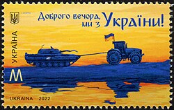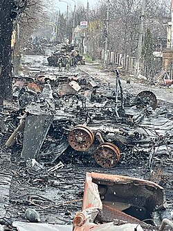 [edytuj | edytuj kod]Po stronie ukraińskiej walczyły przede wszystkim regularne Siły Zbrojne Ukrainy, uzupełniane przez Gwardię Narodową Ukrainy. Główny ciężar walk spoczywał na wojskach lądowych Sił Zbrojnych, które były w stanie powstrzymać i opóźnić przeważające siły rosyjskie. Szczegóły działań regularnych ukraińskich wojsk lądowych nie są upubliczniane przez ukraińskie ministerstwo obrony ani walczących żołnierzy[42]. Dla wzmocnienia morale szeroko nagłaśniane, zwłaszcza w mediach społecznościowych, były natomiast sukcesy Gwardii Narodowej, niszczącej głównie kolumny logistyczne za głównymi siłami rosyjskimi[42]. Ochotnicy spoza Ukrainy weszli w skład Międzynarodowego Legionu Obrony Terytorialnej Ukrainy[51]. Wspierający Ukrainę Rosjanie weszli w skład Legionu Wolność Rosji i Rosyjskiego Korupusu Ochotniczego[52], zaś Białorusini Pułku im. Konstantego Kalinowskiego[53].