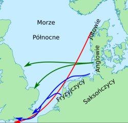 Angielszczyzna jest językiem zachodniogermańskim, który wywodzi się z anglo-fryzyjskich i jutlandzkich narzeczy przyniesionych do Brytanii przez germańskich osadników i rzymskie wojska z terenów obecnych północnych Niemiec i Holandii[7]. Na początku język staroangielski był zróżnicowaną grupą dialektów, obrazującą różnorodne źródła anglosaskiej ludności ówczesnej Anglii. Jeden z tych dialektów, późny zachodniosaski, w końcu zyskał przewagę. Pierwotny staroangielski był następnie pod wpływem obcym ze względu na dwie fale inwazji. Pierwsza to inwazja wikingów, użytkowników języków skandynawskich; zdobyli oni i skolonizowali część Brytanii w ósmym i dziewiątym wieku. Druga to inwazja Normanów w XI wieku. Mówili oni językiem starofrancuskim i rozwinęli anglo-normańską odmianę języka angielskiego[8]. Te dwie inwazje spowodowały, że angielszczyzna stała się do pewnego stopnia językiem mieszanym.