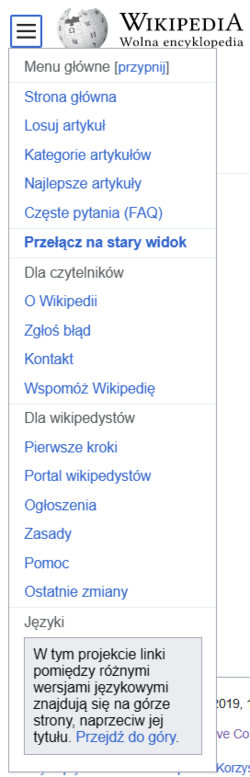 Główne menu to element Wikipedii, który może być widoczny na stałe lub pokazywany na życzenie użytkownika po naciśnięciu przycisku „hamburger” (który we wstępie oznaczono literą [A]). To menu zawiera linki do najważniejszych stron na Wikipedii, takich jak Ostatnie zmiany czy FAQ. Jego zawartość pokazano na obok. Aby wyświetlać menu zawsze, nie tylko po kliknięciu przycisku obok logo, należy wybrać opcję [przypnij] w nagłówku menu. Spowoduje to, że będzie się ono wyświetlało zawsze z lewej strony artykułu, nad spisem treści.
