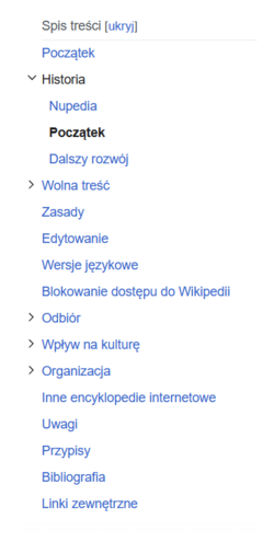 Spis treści pokazywany jest z lewej strony artykułu. Utrzymywany jest w tym miejscu również po przewinięciu strony w dół. Można go schować, korzystając z przycisku [ukryj] w nagłówku spisu. Będzie on wtedy dostępny po naciśnięciu przycisku z ikoną
