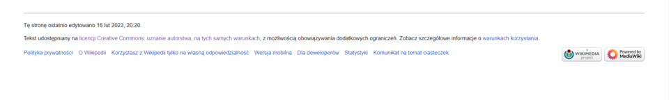 Stopka zawiera informacje o ostatniej edycji danej strony Wikipedii, sprawach licencyjnych oraz linki „Polityka prywatności”, „O Wikipedii” i inne. W stopce umieszczone są również ikonki-odnośniki z logo MediaWiki (oprogramowania Wikipedii) oraz Wikimedia Foundation (fundacji utrzymującej Wikipedię).