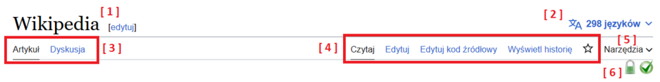 - [3] link do dyskusji – pozwala na przechodzenie między stroną, a przypisaną do niej stroną dyskusji; kolor czerwony którejkolwiek z tych zakładek oznacza, że dana strona nie istnieje i można ją utworzyć (np. nikt nie rozpoczął dyskusji na temat hasła);