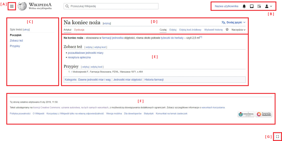 Interfejs Wikipedii dzieli się na trzy główne obszary, które na Rys. 1 oznaczone są literkami [C], [E] i [F] (literką D oznaczona jest część strefy E). Ponadto, u góry dostępne są elementy nawigacyjne, podpisane [A] i [B]. Kolejne z nich to to odpowiednio: