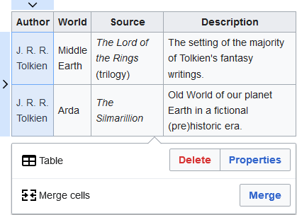 Tabele można edytować zarówno w kodzie źródłowym, jak i za pomocą edytora wizualnego. Jeśli chodzi o kod źródłowy, zalecane jest używanie znaczników składni wiki (znaczniki te w większości muszą zaczynać się na początku nowej linii).