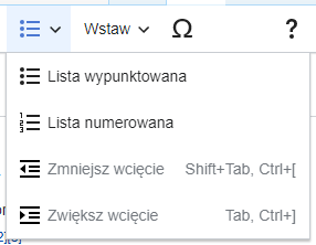 Listy i wcięcia: pierwsze dwa elementy pozwalają formatować tekst jako „Lista wypunktowana” albo „Lista numerowana”. Kolejne dwa służą do powiększania lub zmniejszania wcięcia listy elementów. |