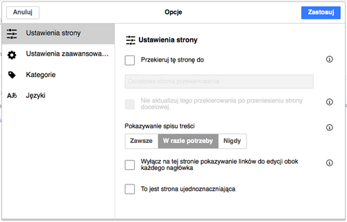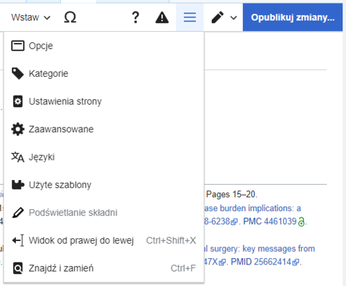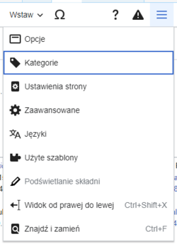 | Menu „Opcje strony” znajduje się na lewo od przycisku „⧼visualeditor-toolbar-savedialog⧽”. W tym menu znajdują się opcje strony, takie jak ustalenie strony jako przekierowanie czy ustalenie sortowania strony w kategorii. Można też dodać, zmieniać czy usunąć kategorie oraz zobaczyć element „Język”, listę artykułów na ten sam temat napisanych w innych językach. Możesz także przełączyć się z edytora wizualnego na klasyczny edytor kodu źródłowego i odwrotnie bez utraty zmian, które wprowadziłeś. | |